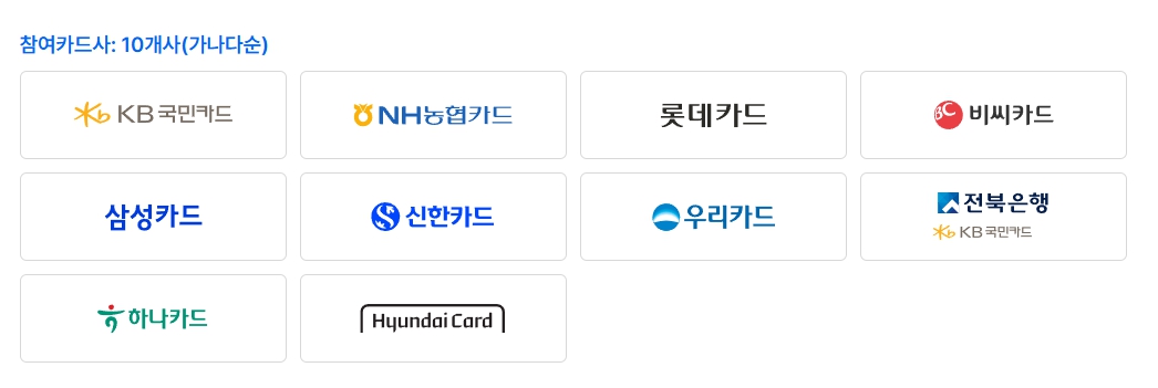 - 지원 카드 - 국민, 농협, BC, 삼성, 신한, 우리, 하나, 현대카드