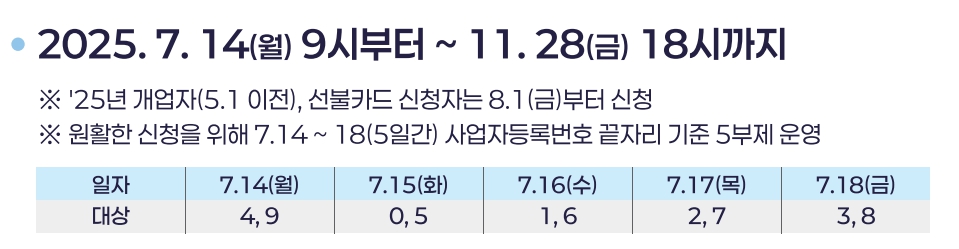 사업자 등록번호 끝자리 기준 5부제로 운영 후 7월 19일 이후 제한없이 신청 가능