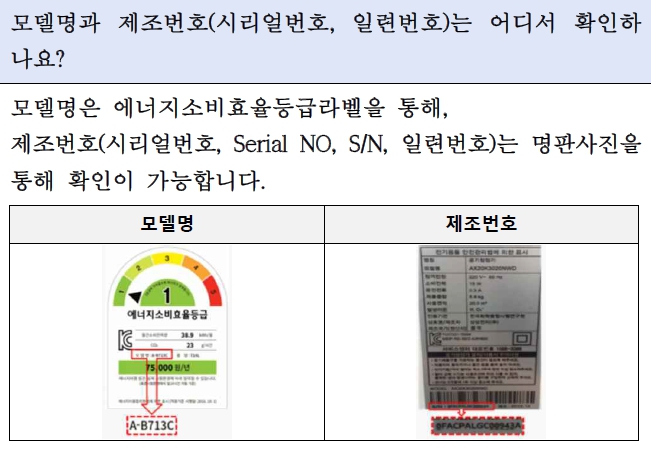 - 제출자료 - 제품에 붙어있는 등급라벨 사진, 제조번호(시리얼번호)가 기재된 명판사진, 거래내영서, 영수증(카드 또는 현금) 등